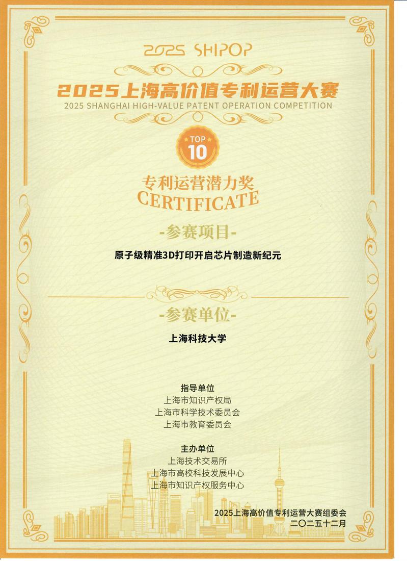 在近期举办的上海高价值专利运营大赛(“上高赛”)决赛暨颁奖典礼上,上科大3个专利项目入围50强:物质科学与技术学院冯继成团队《原子级精准3D打印开启芯片制造新纪元》、信息科学与技术学院任奕名团队《基于激光雷达的非穿戴式多场景三维动作捕捉系统》、信息科学与技术学院傅旻帆团队《灵枢永动——新一代脑机接口无线快充系统》。其中,冯继成团队项目获“专利运营潜力奖(未转化组)”(10强之一)。上科大技术转移办公室(OTT)获“专利运营机构贡献奖”。